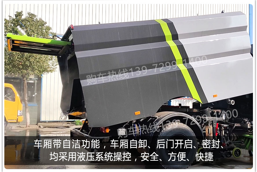 11. 垃圾箱為舉升自卸結(jié)構(gòu),垃圾箱內(nèi)帶有高壓出水自潔裝置,整體傾倒角度>50°,垃圾傾倒更徹底。
