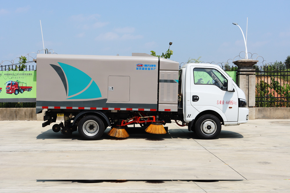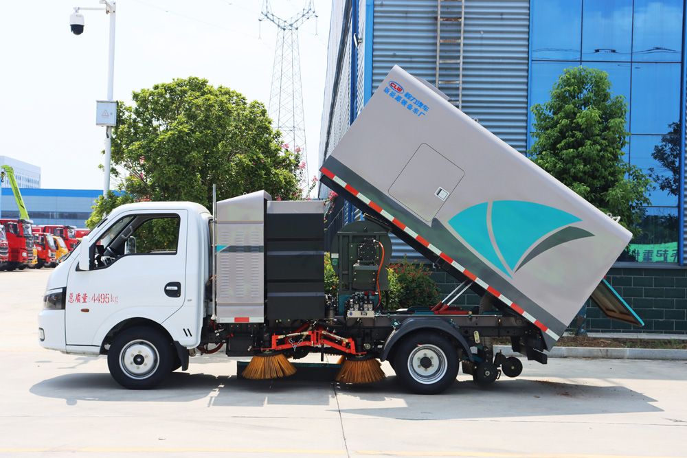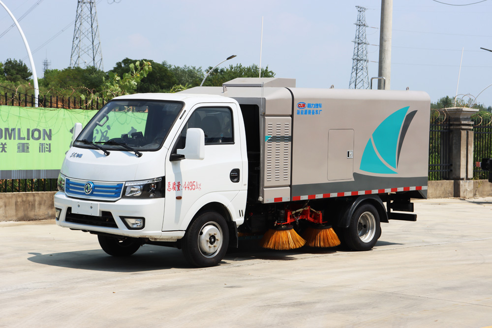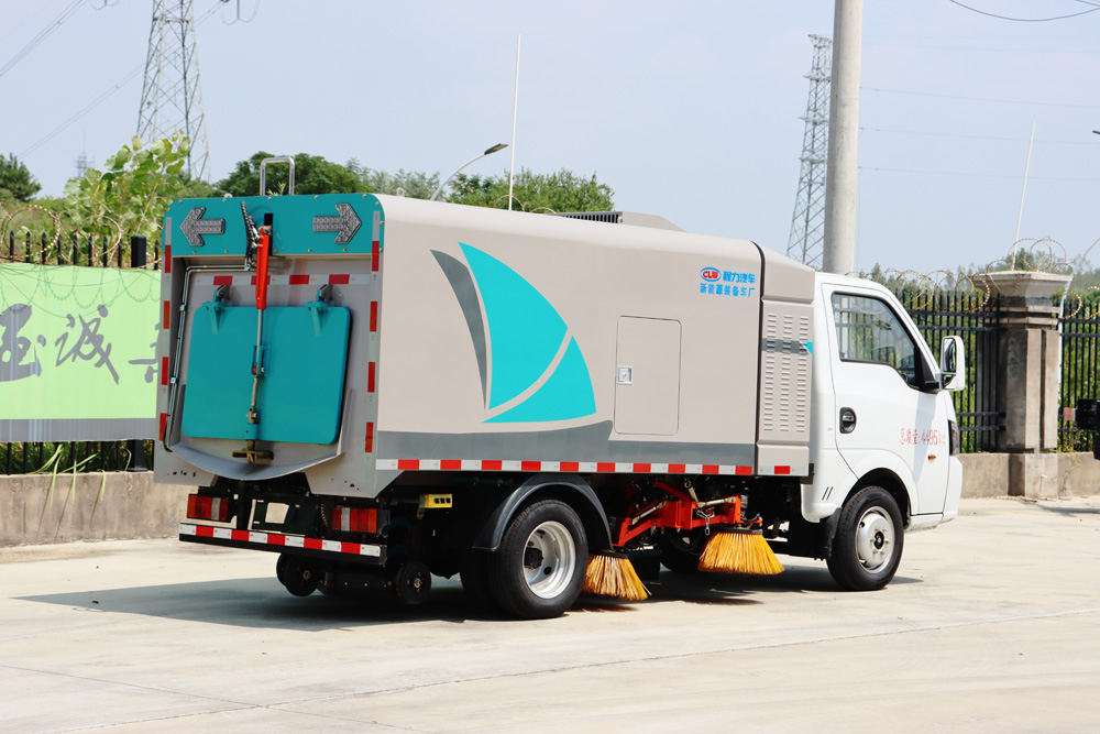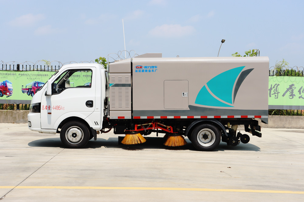 3、掃路車采用東風純電動二類汽車底盤改裝,加裝風機、清水箱、垃圾箱、左右立掃、帶噴水桿的寬吸嘴、