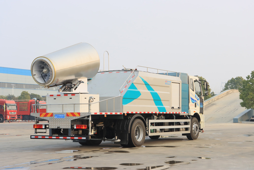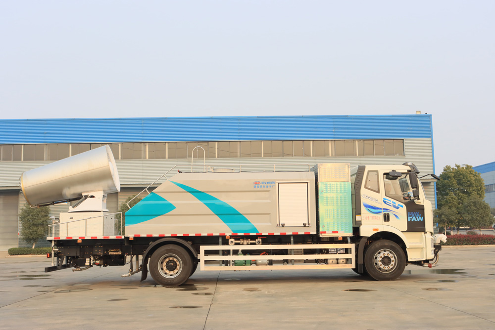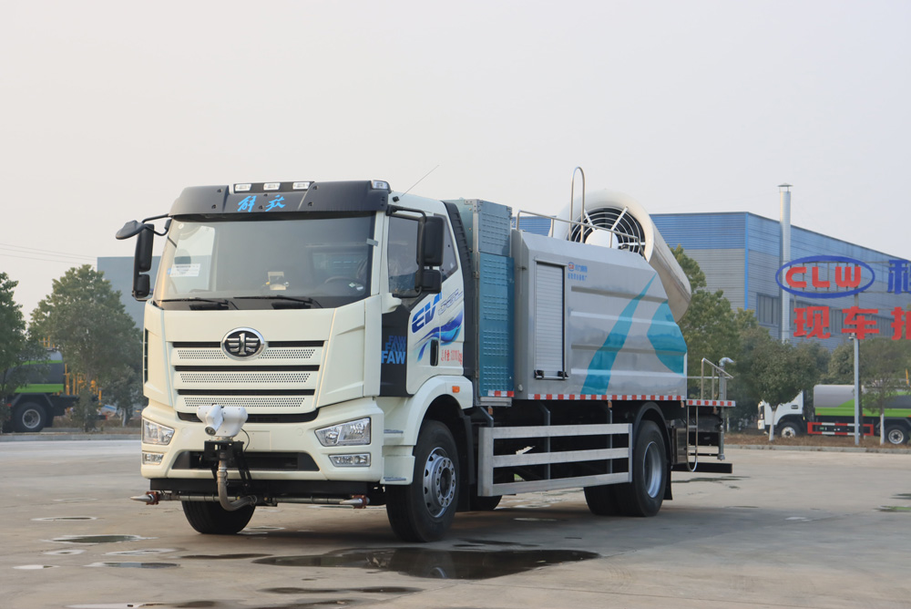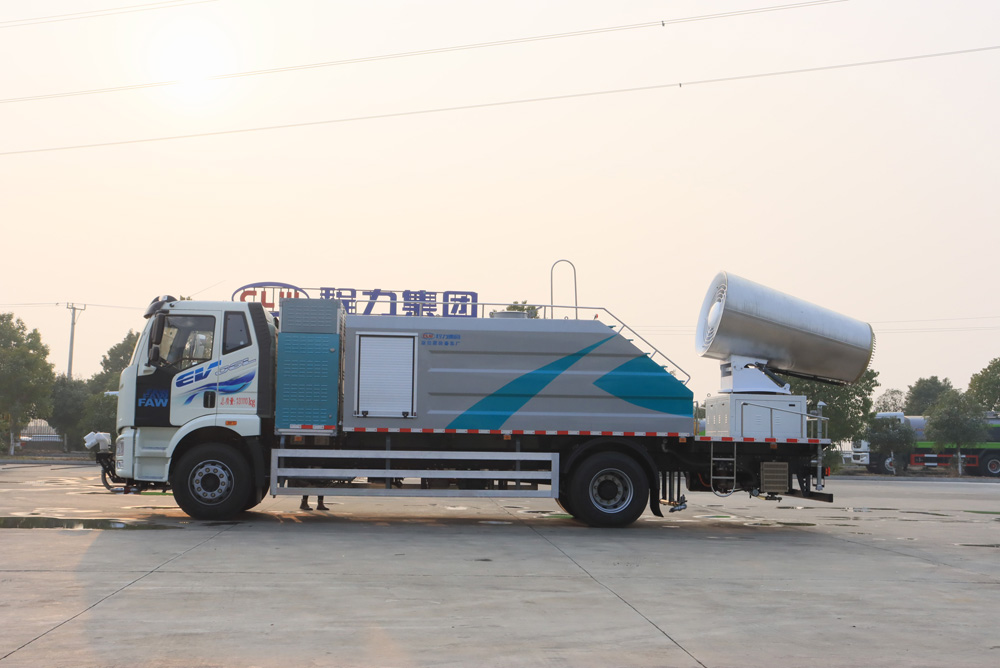 四、其他說明: 解放純電動抑塵車是在純電動二類底盤的基礎(chǔ)上,加裝低壓沖洗、灑水系統(tǒng)、霧炮機(jī)組,由機(jī)械、液壓(氣路)、電器三部分合為一體的專用灑水作業(yè)車。工作原理:采用自吸式雙級離心泵,效率高、灑水寬度大、水槍射程遠(yuǎn),低壓水泵由底盤變速器取力器通過傳動軸直接傳動。霧炮機(jī)組由底盤電池帶動霧炮風(fēng)扇電機(jī)、不銹鋼多級離心泵,進(jìn)行噴霧降塵工作。