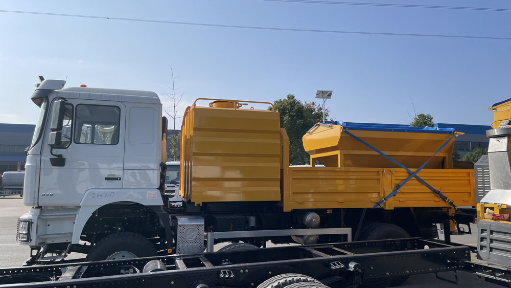 一、底盤配置: 采用陜汽德龍SX1189LA1F1C車身,配置玉柴B6.2NS6B210發動機154/210馬力,國六排放標準,軸距4700,5100,5300(mm),整備質量8.8噸,額定載質量9.305噸,五擋變速箱,帶動力轉向,帶原廠空調,該車專用裝置為融雪劑撒布機,主要用于冬季道路除雪.該車僅在除雪作業時安裝除雪鏟和除雪滾刷.僅選用4000,4500,4700軸距(mm);車該車上黃牌,城區道路請注意限行標識。